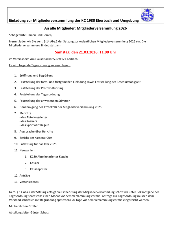 Startseite, Aktuelles, Hauptverein 21.02.2026 Wir laden alle Mitglieder herzlich ein zur Jahreshauptversammlung