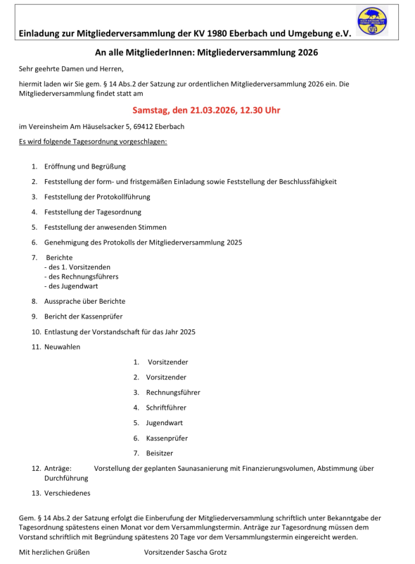 Startseite, Aktuelles, Hauptverein 21.02.2026 Wir laden alle Mitglieder herzlich ein zur Jahreshauptversammlung